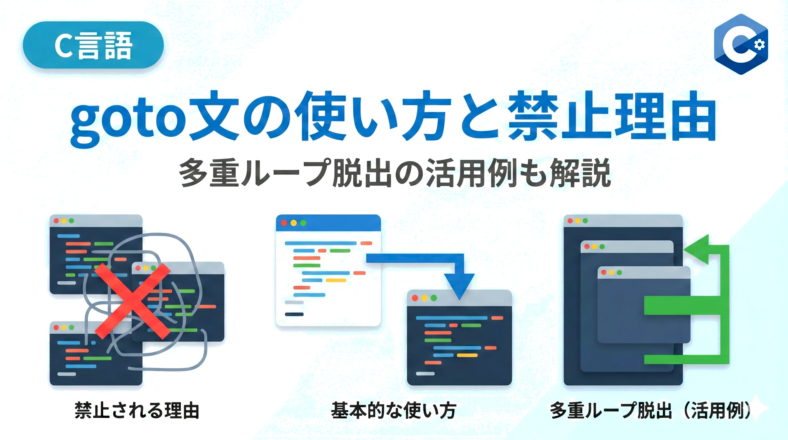 C言語のgoto文|使い方と禁止される理由・多重ループ脱出の活用例を解説
